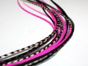 - These Hair Feather colors are Hot Pink Black and Grizzly all bonded together at the tip.